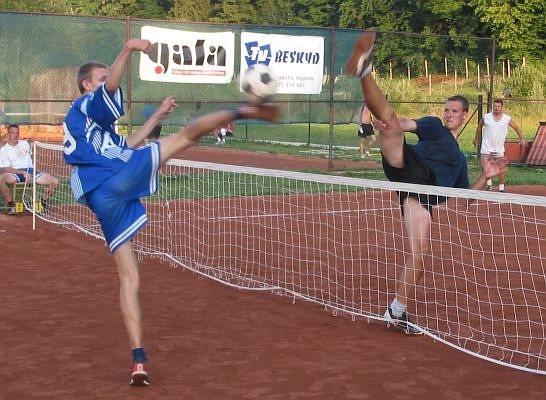 Semifinále výkonnostní kategorie: NK Kúpele Piešťany B × TJ Sokol Pustkovec Smečující Daniel Krájčík a blokující Dušan Padyšák