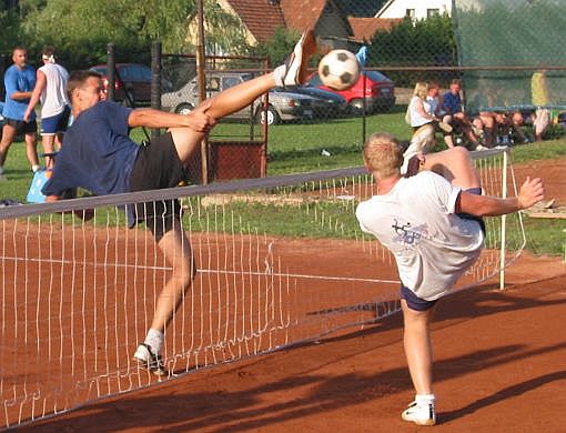Čtvrtfinále výkonnostní kategorie: TJ Sokol Pustkovec × Prašivky Blokující Dušan Padyšák a smečující Tomáš Ertelt