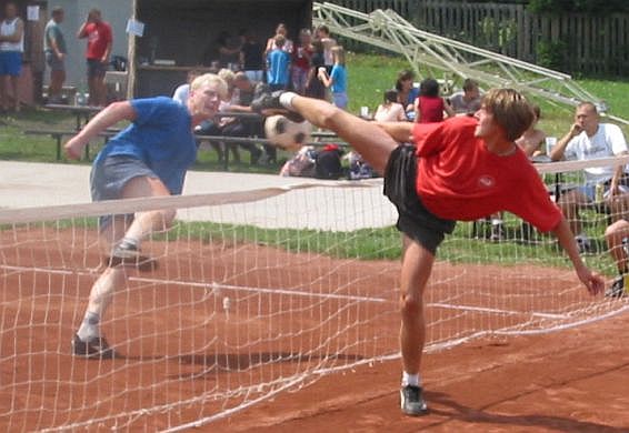Skupina D výkonnostní kategorie: NK Valašské Meziříčí × NK Vsetín dorost B Smečující Martin Andris a blokující Jan Vychopeň.