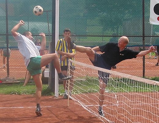 Skupina A výkonnostní kategorie: NK Necpaly × VPV Smečující Gabo Vozár a blokující Stanislav Janík (VPV = uskupení hráčů Val.Mezu, Pustkovce a Vsetína)